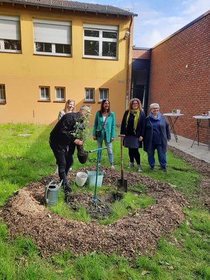 Die Schopis hießen die Gäste mit einem kleinen Willkommenslied und einem Gedicht zum Thema "Gartenarbeit" willkommen. Danach konnten bei einem Rundgang die Beete, die Blühwiese, die Nistkästen und das Insektenhotel bestaunt werden. Der Bezirksbürgermeister, Herr Kunstmann, hatte die Ehre und durfte einen kleinen Apfelbaum pflanzen. Dabei erhielt er tatkräftige und fachliche Unterstützung von Herrn Peuser, dem Vorsitzenden des Heimatvereines Mengede. Im Anschluss tauschten sich die Schulleiterin Frau Bracker sowie die Projektleiterinnen Frau El-Fakharany und Frau Hübinger mit den Gästen bei einem Gläschen Zitronen-Minz-Limonade über die zukünftigen Pläne aus. Kurzfristig benötigt der Schulgarten dringend einen Regenwassertank, damit nicht das kostbare Leitungswasser für die Bewässerung verwendet werden muss. Langfristig wünschen sich die kleinen und großen Schopis ein Freiluftklassenzimmer. Die Entstehung und Weiterentwicklung des Schulgartens wird in einem digitalen Tagebuch festgehalten. Mittels eines QR-Codes können so die Schüler*innen und deren Familien sich immer über die Fortschritte informieren. Der Schulgarten ist ein weiterer Schritt der Schopenhauer Grundschule in Richtung „Bildung für Nachhaltige Entwicklung“. In unserer modernen Gesellschaft, in der die Menschen durch Digitalisierung und Globalisierung, Inklusion und Integration vor große Herausforderungen gestellt sind, bekommt der Schulgarten eine ganz neue und zentrale Bedeutung. Komplexe Themen wie „Nachhaltigkeit“ und „Artenvielfalt“ sollen den Schülerinnen und Schülern begreifbar gemacht werden.