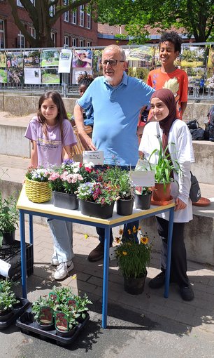 Nachmittags konnten sich Eltern, Schüler*innen und Lehrer*innen auf dem Schulhof in der Regensburger Straße bei Kaffee, Kuchen und Limo die verschiedene Projekt der Garten-Werkstatt ansehen, darunter Hochbeete mit Kräutern und Blumen, Pflanzenmarkt mit selbst aus Keimen gezogenen Pflanzen, das Kartoffelbeet der Ukrainischen Kinder des Vorkurses, Nisthilfen für Bienen.