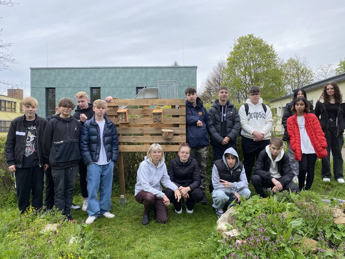 Auf dem Pausenhof der Regelschule Niederzimmern werden sich bald die Wildbienen tummeln. Zumindest ist das die Hoffnung der Schüler der Klasse 9, die kürzlich im NT-Unterricht mit Lehrerin Kerstin Glück ein besonderes Projekt realisiert haben. Gemeinsam mit vier Studenten der Universität Erfurt und ihrer Schulgarten-Dozentin Simone Buss haben die 16 Schüler ein kleines Insektenhotel auf dem Schulgelände errichtet.