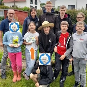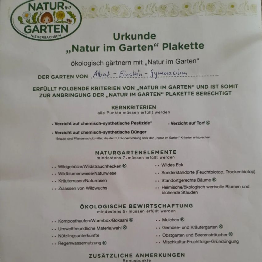 Am 10. Juni wurde in Einsteins Schulgarten in diesem Jahr ein besonderer Tag des Schulgartens gefeiert, denn wir haben nicht nur unsere Gartenpforte für die Öffentlichkeit geöffnet und nicht nur all den lieben Menschen Danke gesagt, die unser Wirken stets mit Rat und Tat unterstützen, sondern unser Garten wurde auch mit der "Natur-im Garten"-Plakette ausgezeichnet und wie uns gesagt wurde, als erster Schulgarten in Niedersachsen überhaupt. Herr Szymanowski hatte einen Kriterienkatalog dabei und unser Garten konnte alles erfüllen. Über die Auszeichnung freuen wir uns sehr und die Plakette wird nun einen schönen Platz bei uns im Garten finden. Unsere Schülerfirma futerra überraschte die Garten-Kids noch mit einem kleinen Geschenk als Wertschätzung für ihren unermüdlichen Einsatz im Garten und für die Natur. Auch dafür sagen wir DANKE!