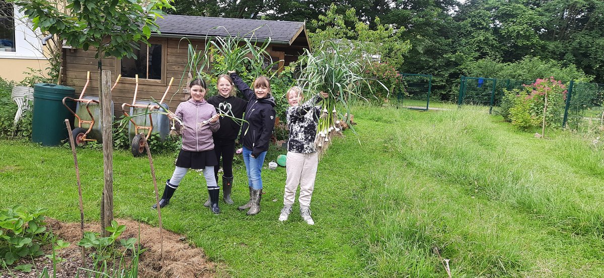 Im Gartenbauunterricht steht zum Tag des Schulgartens die Knoblauchernte an. Der Knoblauch wird zum Trocknen aufgehängt und dient zum Würzen unserer wöchentlichen Gartensnacks: zum Beispiel Brennnesselchips oder Zucchinipfannkuchen mit Knoblauchdip.