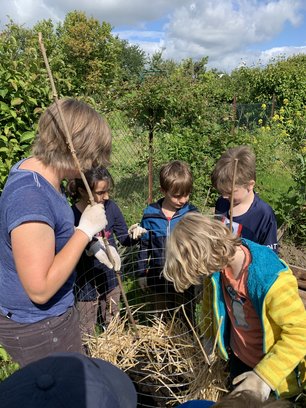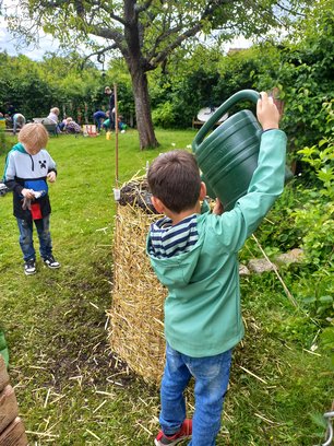 zwei Aktionen abseits ihrer regelmäßigen Einsätze im Schulgarten geplant und umgesetzt. Zum einen wurde das Milpabeet neu mit Mais, Bohnen und Kürbis bepflanzt, zum Zweiten wurde eine Kartoffelturm gebaut und bestückt. Mit viel Eifer haben die Kinder die Erde mit Kompost gemischt, das Drahtgestell mit Stroh ausgekleidet und dann in mehreren Schichten gekeimte Kartoffeln eingepflanzt. Zum Abschluss wurde natürlich kräftig gegossen. Nun sind alle sehr gespannt, wie der Turm nach den Ferien aussieht und wo sie die Kartoffelpflanzen entdecken können. Und wie im Herbst wohl die Ernte ausfallen wird?