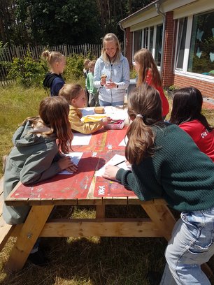 Beim Tag des Schulgartens war auch Frau Benecke da. Sie ist beim RuZ Huntlosen-Hollen, aber auch Lehrerin unserer Schule. Sie hat viele Dinge mitgebracht, mit denen man etwas über Insekten lernt. Jonte hat uns erklärt: „Insekten bestäuben alles, egal ob Bäume, Blumen, einfach alles, deshalb sind sie so wichtig.“ Das findet auch Frau Benecke, denn man müsse Bescheid wissen, damit man die Insekten zu schätzen weiß, sagt sie. Deshalb konnte man zum Beispiel ein Insekt aus Holz zusammenbauen. Es gab auch andere Dinge die man machen konnte, wie seine Lieblingsecke des Schulgartens malen, Erdbeeren probieren oder eine Führung von Frau Brand-Jakopaschkes DaZ Kurs bekommen, Kräuter am Duft erraten, Gemüse am Aussehen erraten und auf Holztäfelchen die Lösung ansehen. Madlen fand es besonders spannend, Insekten mit Lupengläsern zu beobachten. Greta und Emma aus der 3s fanden den Nachmittag sehr spannend und cool. Sie wissen jetzt, dass ein Insekt 6 Beine hat. Frau Brand-Jakopaschke hat sich gefreut, dass alle Kinder so viel Spaß und Freude am gemeinsamen entdeckenden Lernen hatten. Auch die Eltern fanden es sehr spannend und hatten, trotz des Regens zwischendurch, viel Spaß. In Zukunft möchte sie was für die Bewässerung machen, einen Geräteschuppen und Vogel- und/oder Igelhäuschen in den Schülergarten bringen. Immerhin hat das Projekt Schulgarten gerade erst begonnen. Wir freuen uns sehr, dass wir den Schulgarten haben und hoffen, dass wir im nächsten Jahr viel Zeit hier verbringen können. Frau Benecke sagte, dass ein Schulgarten ein Ort zum Wohlfühlen sein soll und das ist er auf jeden Fall! Zusammengefasst hat es Greta aus der 2d: „Es macht viel Spaß und Freude im Schulgarten.“ (von Rieke, Greta 2d, Frau Depenbrock - AG Schülerzeitung)