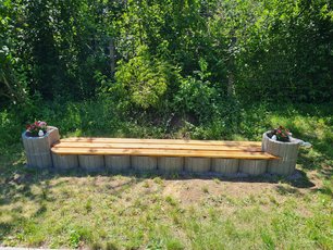 Außerdem bauten wir eine Bank vor dem Barfußpfad des Schulgartens, auf der die Kinder ihre Schuhe wechseln können. Wir begannen damit, ein 4m x 50cm großes und ca 5cm tiefes Loch zu schaufeln. Dieses füllten wir mit Beton. Gleichzeitig stellten wir zehn Pflanzringe nebeneinander darauf, in die wir Kies schütteten. Doch den zweiten und neunten füllten wir nur zur Hälfte mit Kies und zur anderen Hälfte mit Beton. Auf die Äußersten wurde dann jeweils noch ein weiterer Pflanzring hinaufgestellt, der mit Blumenerde, Nelken und einem Vogel-Topfstecker ausgestattet wurde. Als nächstes schnitten wir Terrassendielen zurecht und lackierten sie mit der Holzschutzlasur. Da kleine Stücke davon übrig blieben, konnten diese als Erhöhung senkrecht an den Dielen befestigt werden. Nun wurde in den Beton des zweiten und neunten Pflanzrings, wie auch in die Mitte der Bank, gebohrt. Dort konnten dann Dübel angebracht werden, wodurch die Dielen nun an die Pflanzringe geschraubt werden konnten und die Bank fertiggestellt wurde.