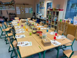 Nach vielen Stunden der Vorbereitung war es am 22. Mai 2024 endlich so weit. Wir, zwei Studentinnen der Universität Erfurt, fuhren schon früh in die „Grundschule an der Geraaue“ und bereiteten das Zimmer vor. Zuerst gab es einen thematischen Input zu gesunder Ernährung, danach sollte das schuleigene Insektenhotel erneuert werden.