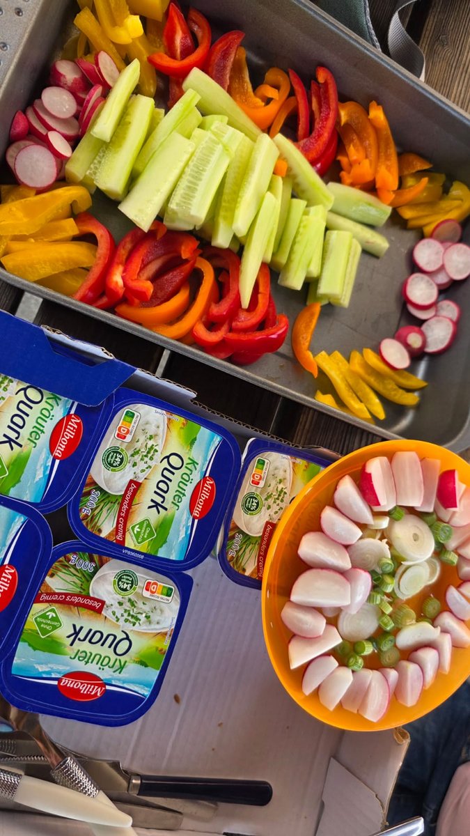Wir haben den bundesweiten Tag des Schulgartens mit einem kleinen Snack gestartet. Es konnten sich Brote mit Quark und unterschiedlichen Gemüse-Sorten belegt werden.