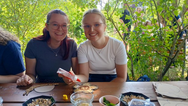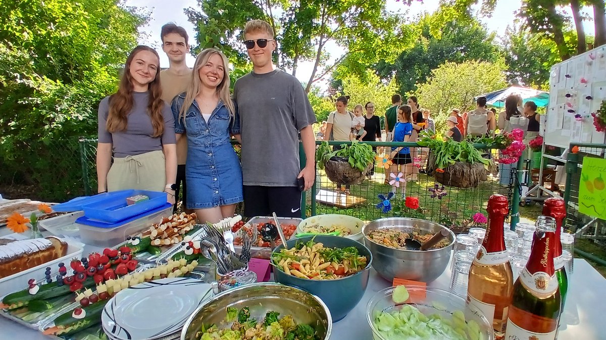 Erfurt ist der einzige akademische Standort, welcher angehende Lehrkräfte im Fach Schulgarten ausbildet. In der Lehrveranstaltung „Gartenbau“ lernen sie Grundlagen und können diese im Seminar „Gartenpraxis“ vertiefend im Campusschulgarten anwenden. Dort übernehmen sie Verantwortung für die Beete, beteiligen sich an Gieß- und Ernteaktivitäten, reflektieren den Kompetenzerwerb in Gartentagebüchern und erweitern durch Praxisprojekte ihren Horizont. Ein Highlight stellt das Schulgartenfest dar, welches im Sommersemester von Studierenden im vierten Semester veranstaltet wird. Auf diese Weise setzen sie sich mit curricularen Anwendungskontexten auseinander, mit denen sie im Lehrberuf konfrontiert sein werden: Der Lernbereich „Gärtnerisches Gestalten“ sieht vor, dass Schüler:innen florales Gestalten trainieren, Beete pflegen, Freude am gemeinsamen Gärtnern zeigen, sowie den Wert der Arbeit schätzen. All diese Kompetenzen spiegelt ein Schulgartenfest wider. So wurde der Garten auch farbenfroh und naturnah gestaltet, sowie mit Musik stimmige Atmosphäre geschaffen. Das Angebot für alle Sinne wurde mit Kuchen, Gegrilltem, Heiß- und Kaltgetränken, Salaten und eigens kreierter Kräuterbowle abgerundet. Die Leseecke, Gartenführungen und eine Infotafel zu den Praxisprojekten veranschaulichten die Arbeit der Studierenden. In der Kreativecke entstanden Körnerbilder und verschiedene Drucktechniken mit Naturmaterialien ließen sich erproben. Hergestellte/geerntete Gartenprodukte und Jungpflanzen konnten gegen Spenden erworben werden, welche dem „Kinderhospiz Mitteldeutschland“ zugutekommen. Für diesen guten Zweck leerte sich das Buffet auch schnell und alle genossen das Zusammensein im Grünen.