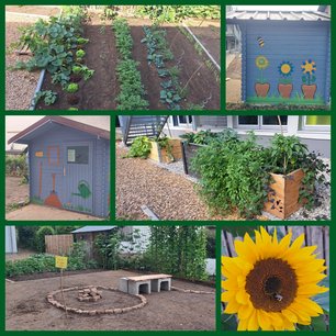 Ein Ideenwettbewerb lieferte kreative Vorschläge für die Gestaltung der alten Gartenhütte, die jetzt in frischen Farben zu einem Spaziergang in den Schulgarten einlädt. Das neue große Bodenbeet haben wir unterteilt und bepflanzt. Die provisorischen Baustellen-Hochbeete haben wir mit viel Muskel- und Schaufelkraft an ihren neuen Platz umgesetzt, mit einem neuen Hochbeet ergänzt und aufgefüllt. Mit Sandsteinen, die wir aus den Baustellenresten retten konnten, haben wir die Vorbereitung für ein Kräuter- und Duft-Beet mit Ruheplätzchen getroffen, so dass die AG im neuen Schuljahr mit diesem Projekt starten kann. Auf Plakaten dokumentierten die Geschichte unseres Schulgartens und unsere aktuellen Projekte.