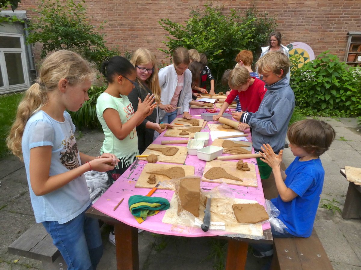 Gespannt warteten die Kinder (4. Schuljahr und die Schulgarten-AG) auf BesucherInnen, die sie durch den Garten führen könnten. Wir hatten unsere Aktion in der Tagespresse und auf Aushängen in einigen umliegenden Geschäften, sowie in unserer Nachbar-Kita bekannt gemacht. Tatsächlich gab es einige Nachbarn und Eltern der Schule und natürlich viele Kinder, die in unser kleines Paradies gekommen sind. Neben unseren Klassenbeeten (Sonnenblumen, Feuerbohnen, Kartoffeln und Gemüse) konnten unsere neue Kräuterspirale, ein Hochbeet, zahlreiche Sommerblumen, heimische Sträucher, Künstlerisches und vieles mehr erkundet werden. Daneben wurden am Vormittag Namensschilder für die Pflanzen im Garten getöpfert. Am Nachmittag konnte man sich je nach Geschmack aus Petersilie, Schnittlauch, Kresse oder anderen Kräutern unseres Gartens einen leckeren, gesunden Kräuterquark zusammenmixen und genießen. Uns hat der Tag riesigen Spaß gemacht!