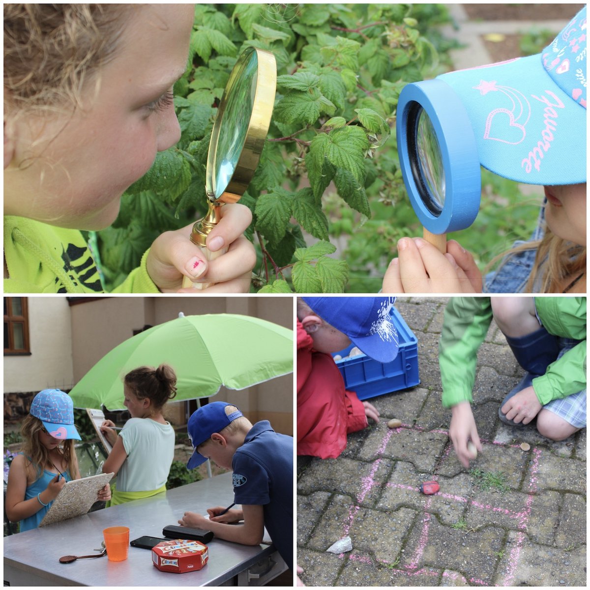 Es galt die 7 Beeren zu finden & zu bennnenn, die in unseren SG „wohnen“; Gegenstände/ Dinge zu kennzeichnen, die typisch für unseren Mosaikgarten sind; mit der Lupe den Namen der Stachelbeere zu beweisen; das „Versteck-Spiel“ der schönen gefärbten Blumen am Abend zu ergründen & Tiere zu suchen/finden/benennen/skizzieren, die sowohl am Tag als auch am Abend mit uns im SG sind. Alle waren so begeistert dabei, dass wir den Regenguss kaum spürten, der plötzlich niedrging. Mit Gummistiefeln wateten wir durch kleine Pfützen, schauten plötzlich auftauchenden Regenwürmern & Nacktschnecken zu.... Es war eine so herrliche Sache, unbezahlbare Momente...