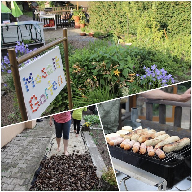 Nach dem Regen, der Quizzauswertung & dem Schmaus waren dann kleine Spiele dran: Seifenblasen-um-die-Wette-Pusten; Abenteuer-Pfad-barfuß-Test; „Steine-Bingo“.