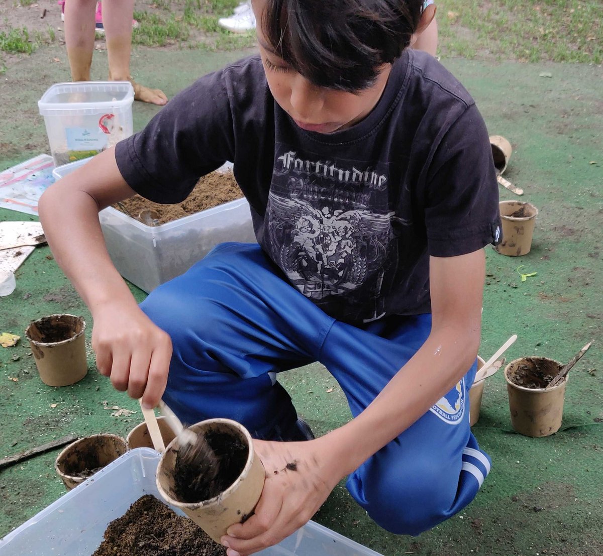 Wir sind eine bunte Schule (soziale Brennpunktschule) mit einem Migrationsanteil, der bei ca.80% liegt. Genauso bunt wie unsere Schülerschaft war auch unser Programm gestaltet. Verschiedene Aktionen, wie ein selbstangelegter Barfusspfad mit einer Lehm-Matschwanne als Highlight, selbstgemachte zuckerfreie Limonade aus Früchten und Kräutern aus dem Garten, Zubereitung von Teemischungen aus Salbei, Minze, Brennnessel, Melisse usw. (wurden erst einmal im Dörrautomaten getrocknet und dann in kleine Tütchen verpackt und verteilt), bienenfreundliche Saatkugeln herstellen und im Stadtteil auswerfen, zählten zu den beliebtesten Aktionen. Des Weiteren legten die SchülerInnen ein Salatbeet an, dazu mussten die vorgezogenen Salatpflänzchen zunächst pikiert werden. Auch die Kreativität kam an diesem Tag nicht zu kurz, so legten die SchülerInnen Naturmandalas auf Baumscheiben, oder gestalteten Naturbilder in Gips, die sie als Wandbild mit nach Hause nehmen durften. Wir setzten kreative Methoden ein und arbeiteten an diesem Tag ausschließlich handlungsorientiert und nicht frontal, damit ein langfristiger Lernerfolg gesichert ist. Wir freuen uns schon auf den nächsten Tag des Schulgartens, dem die Schüler-, Lehrer- und Elternschaft schon mit Freuden entgegensieht.